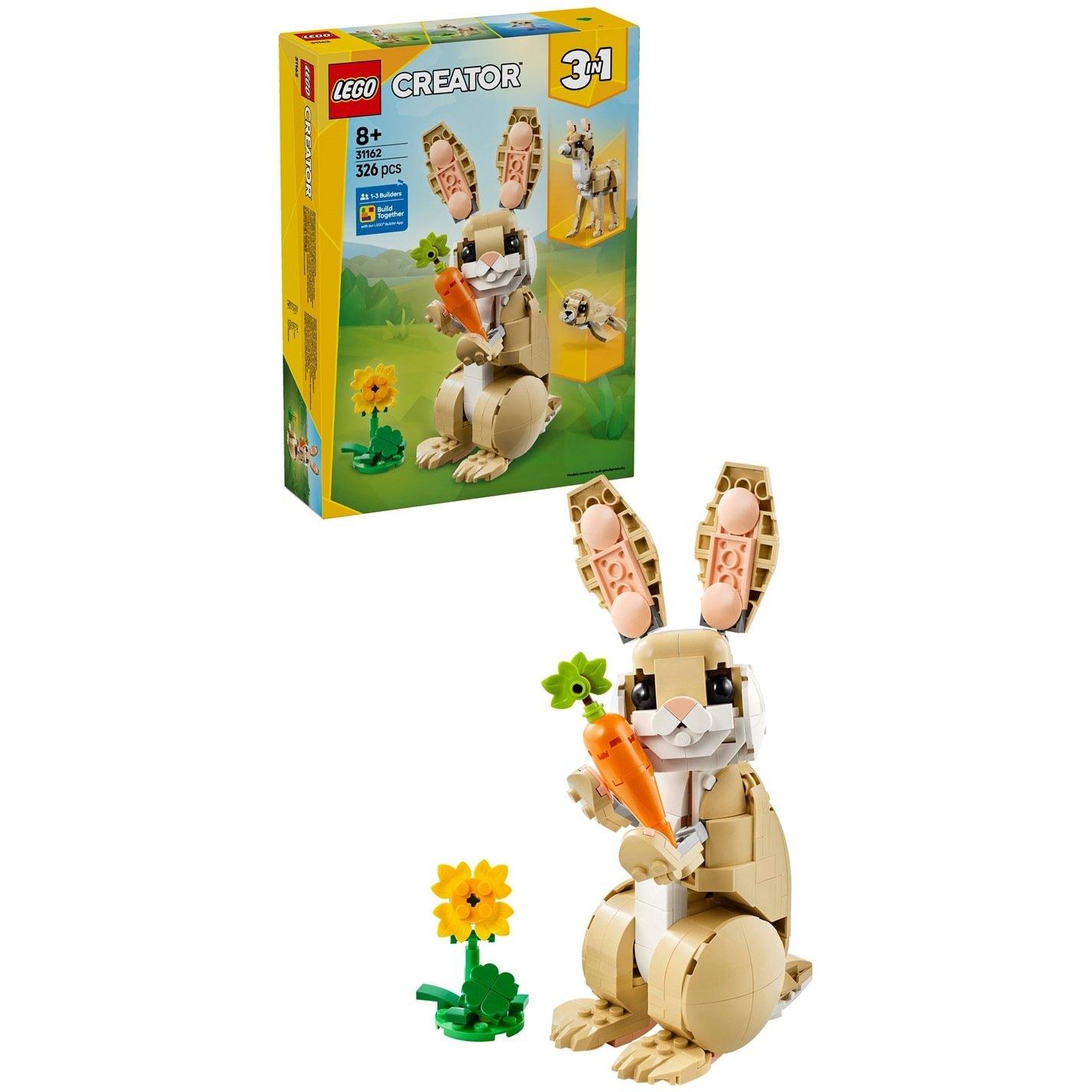 Deja que los niños amantes de los animales disfruten de divertidas aventuras con este set de construcción LEGO Creator 3en1 Conejito Lindo (31162). El set de juego de animales presenta un juguete de conejito para niños y niñas de 8 años en adelante, con una cabeza, orejas y patas posables, que puede estar de pie sobre 2 o 4 patas, y viene con un girasol y una zanahoria.