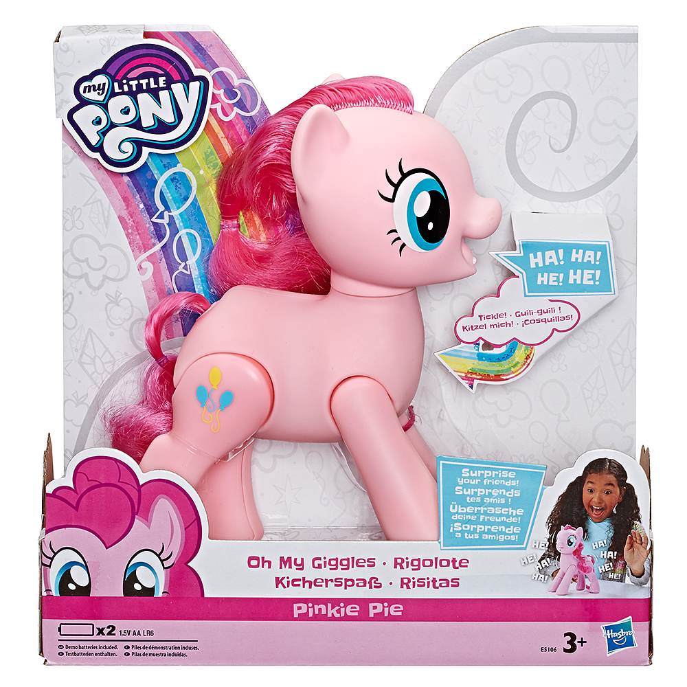 FIGURA DE PINKIE PIE RISUEÑA: ¡Oh My Giggles Pinkie Pie es un juguete interactivo con sonidos y movimiento! La figura mide 20 cm de alto y tiene pelo largo. ACTIVA LOS SONIDOS CON COSQUILLAS: ¡Haz cosquillas en el pecho de la figura de Pinkie Pie para hacerla reír y moverse! Cuanto más la hagas cosquillas, más fuerte se reirá y más rápido se moverá. ACTIVADO POR MOVIMIENTO: El sensor ubicado en la boca de la figura puede activar sonidos y movimientos. Pasa tu mano sobre el sensor o camina junto a la figura para una sorpresa risueña. INSPIRADO EN EL ENTRETENIMIENTO: Pinkie Pie es un pony rosa con melena y cola rosa. ¡Le encanta dar fiestas, sorprender a sus amigos y hacer reír a la gente! La figura está inspirada en su personaje en el programa de televisión My Little Pony: La Magia de la Amistad y en la película My Little Pony. EDADES DE 3 AÑOS EN ADELANTE: Este juguete de My Little Pony con efectos de sonido es un gran regalo de vacaciones o cumpleaños para niñas y niños de 3 años en adelante.