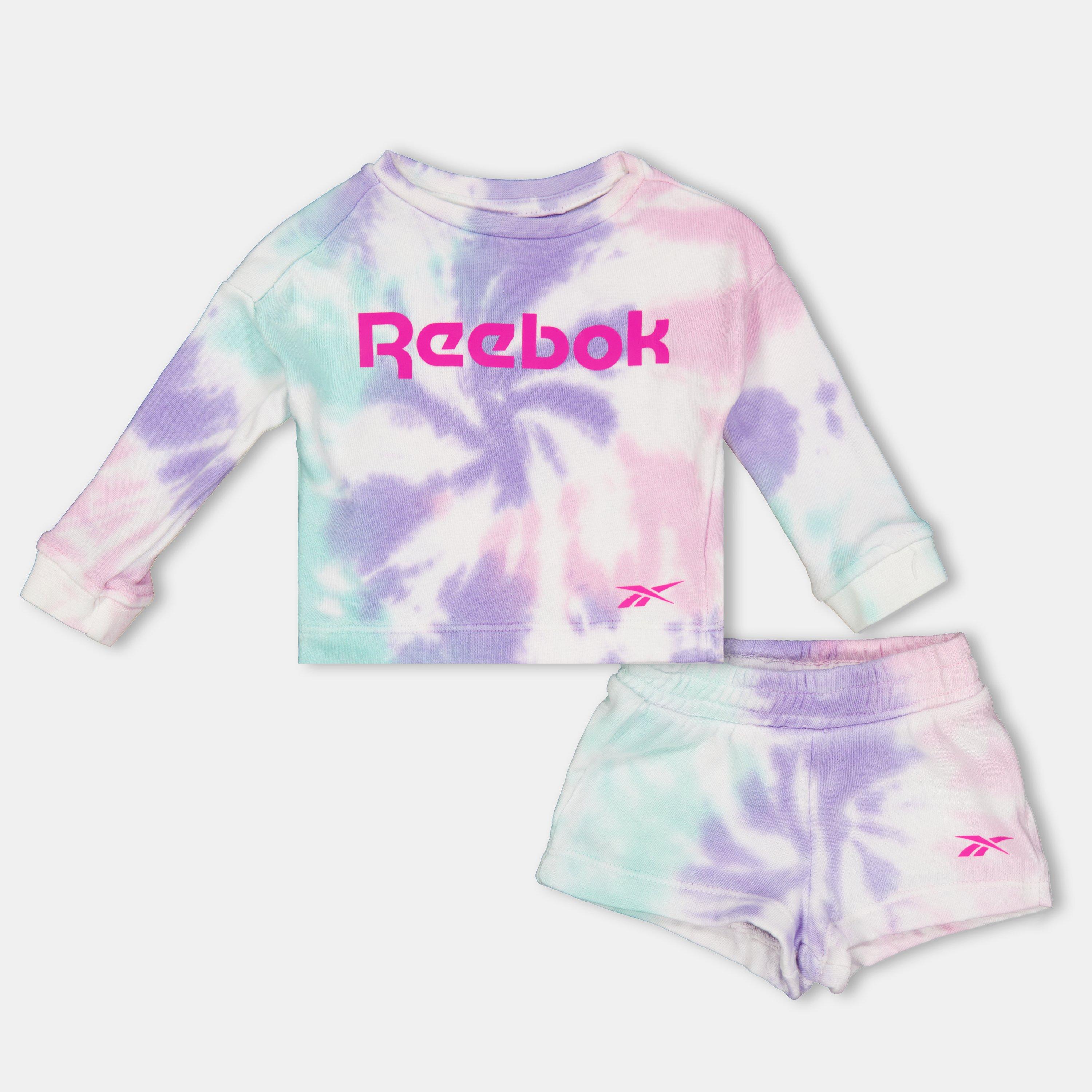 El conjunto de camiseta y pantalones cortos de tie dye para niños de Reebok presenta patrones de tie dye con un estilo coordinado, ofreciendo tanto un impacto visual como comodidad práctica para el uso diario casual.