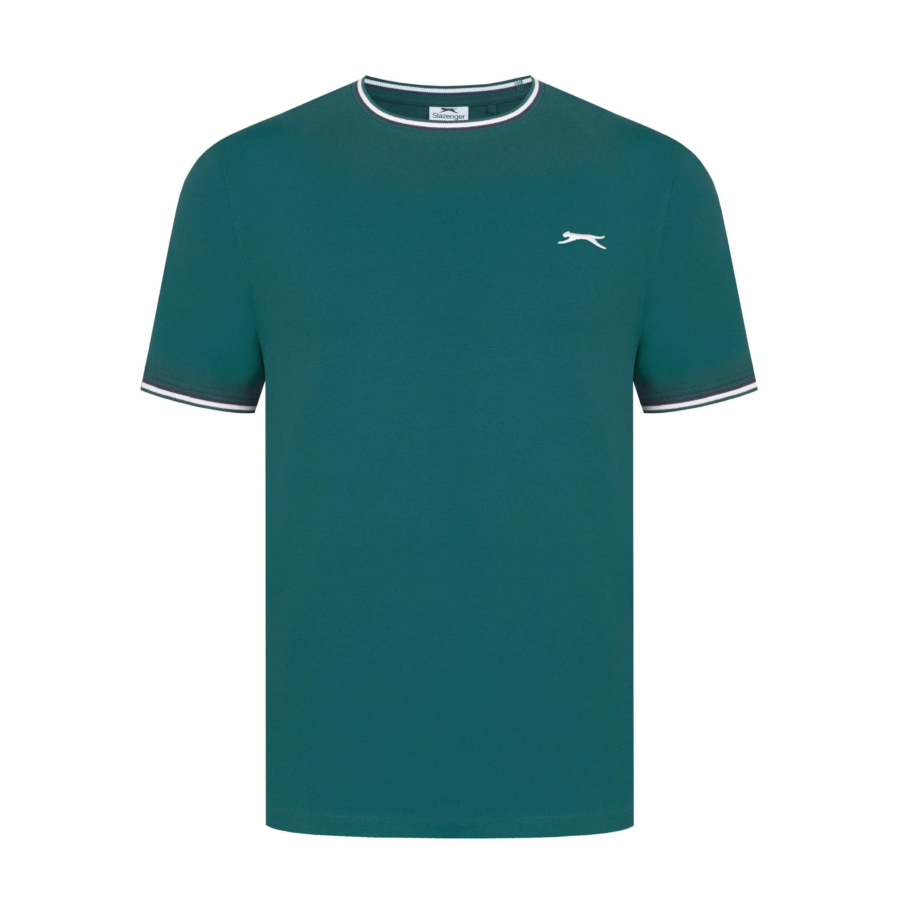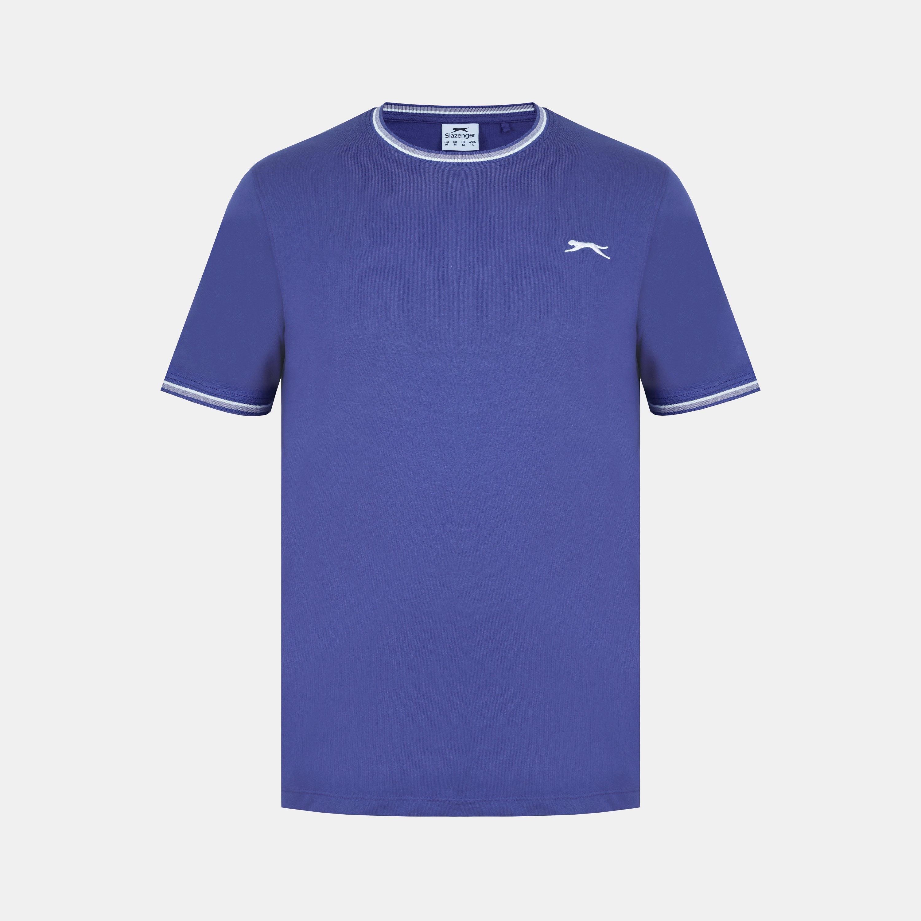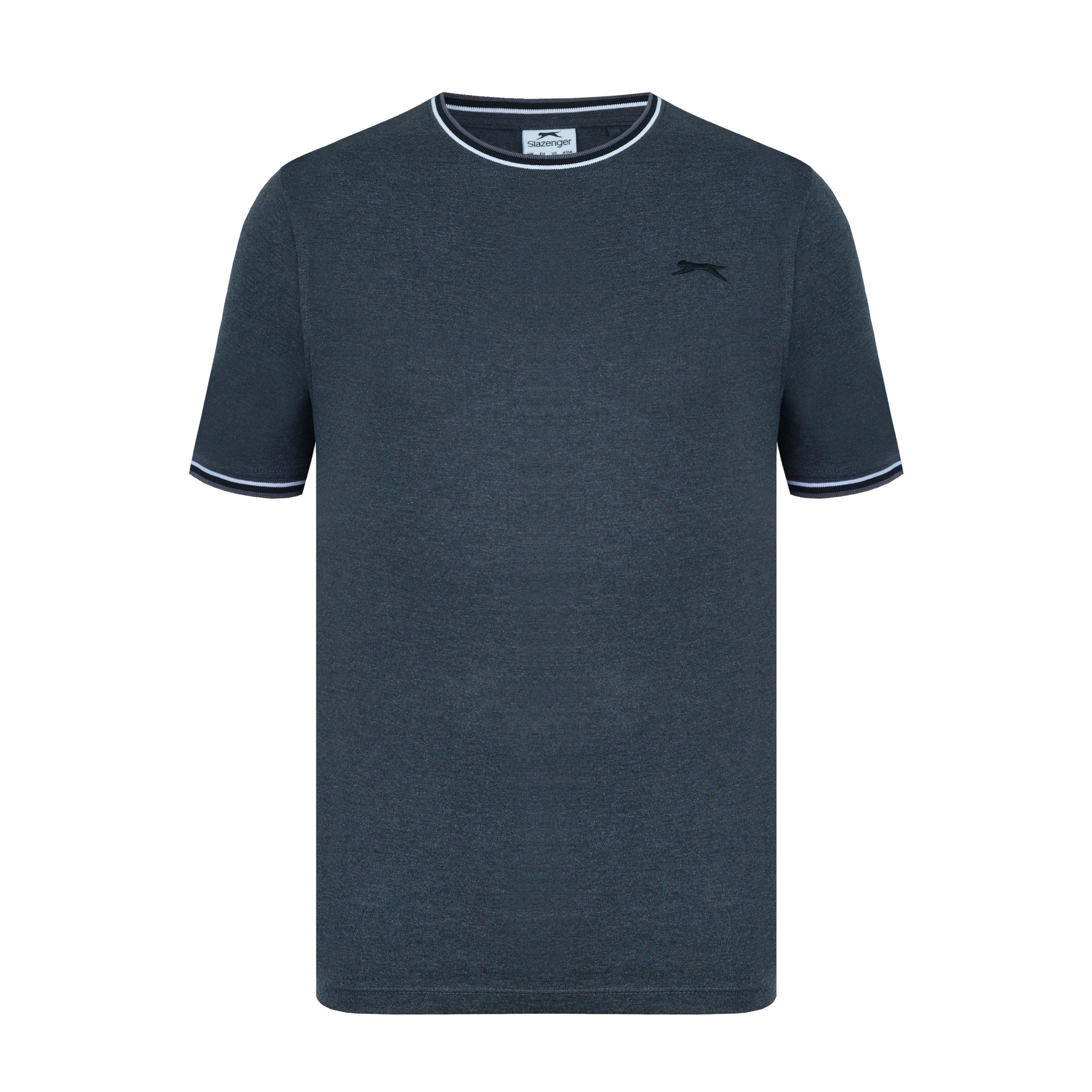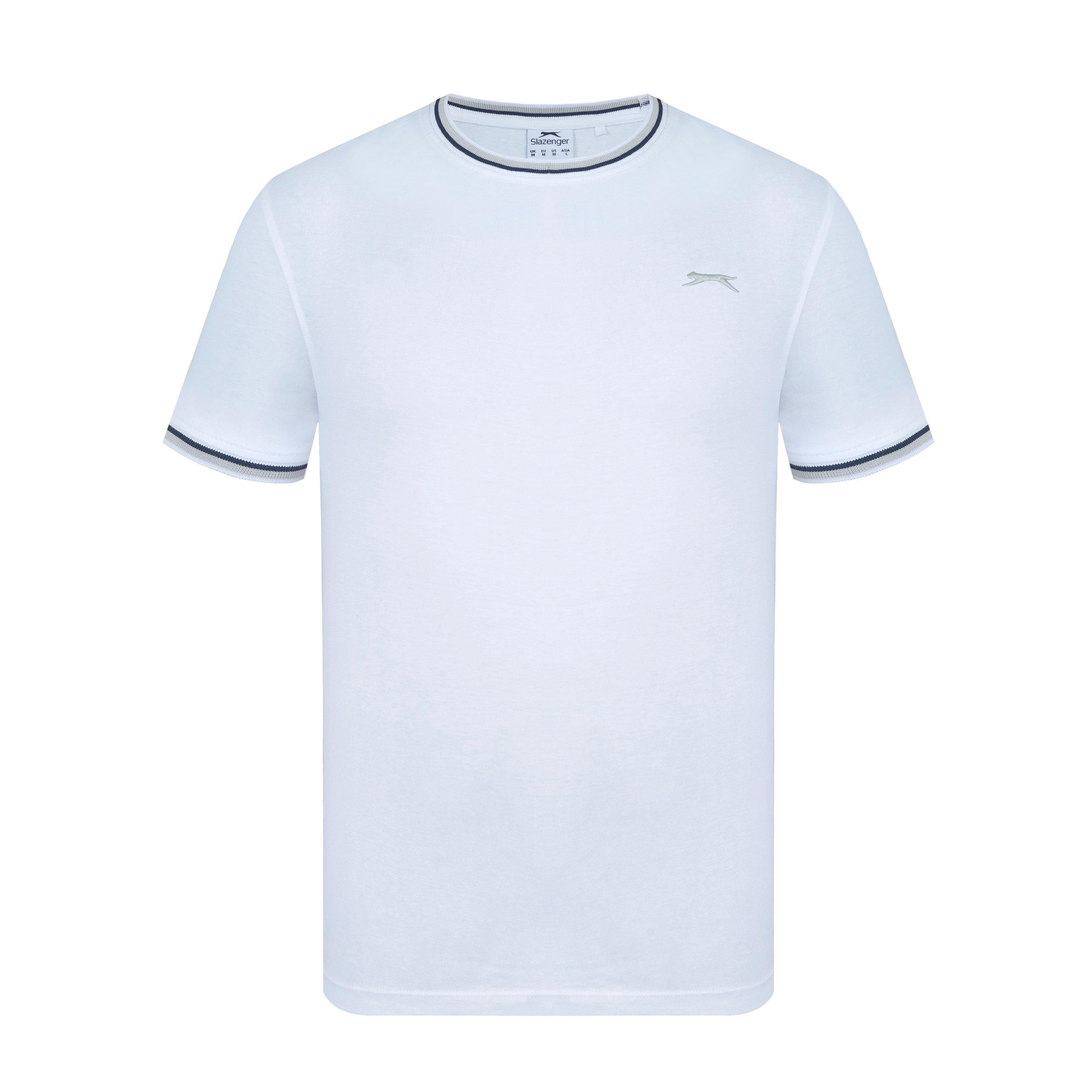 Camiseta de hombre Slazenger con ribete Esta camiseta Slazenger con ribete presenta mangas cortas con un puño acanalado con ribete para un toque de color. Cuello redondo con ribete para un aspecto clásico. Ajuste cómodo y construcción ligera. Esta camiseta está diseñada con un logotipo 3D bordado en el pecho para la marca distintiva Slazenger. 100% algodón