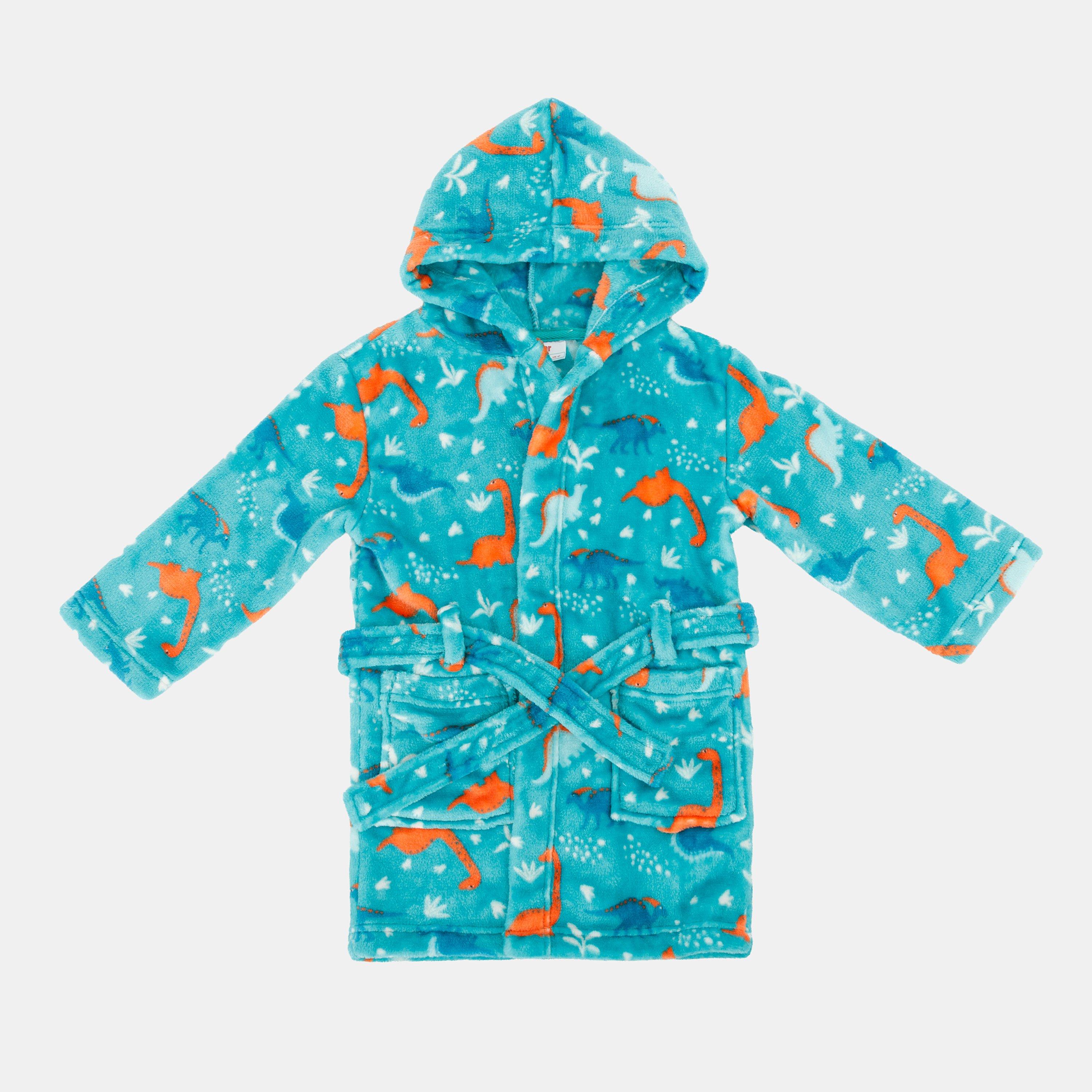 This adorable sleep robe features a fresh Tiffany blue base color adorned with playful orange dinosaur prints, complemented by blue dinosaur silhouettes and white botanical/starburst accents, creating a whimsical prehistoric jungle theme. These are fleece fabric with 100% Polyester robes suitable for boys. It is soft and comfortable to wear, which will make children happier.